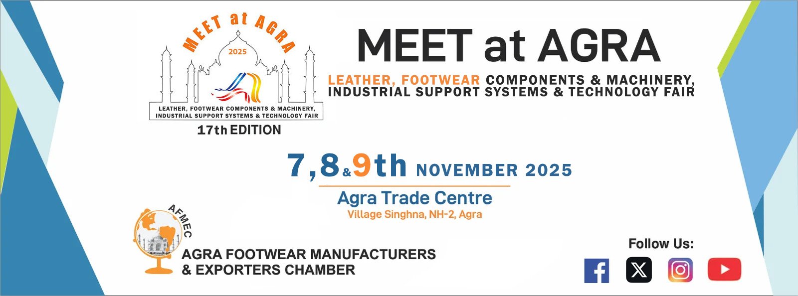 Join us for the 17th Edition of Meet at Agra — India’s premier Leather, Footwear Components & Technology Fair, taking place from 07th to 09th November 2025 at the Agra Trade Centre, Village Singhna, NH-2, Agra, Uttar Pradesh, India.